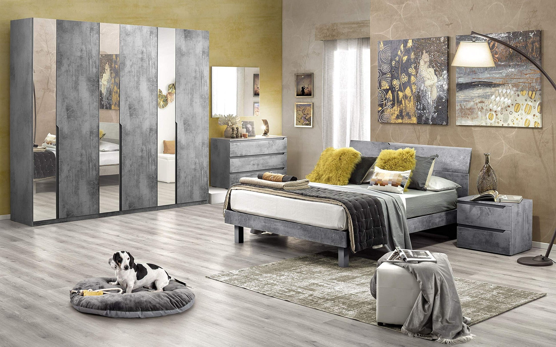 Dafne Italian Design Camera Completa - Cemento Grey (Letto Matrimoniale, Armadio, Comodino, Specchiera, Comò)