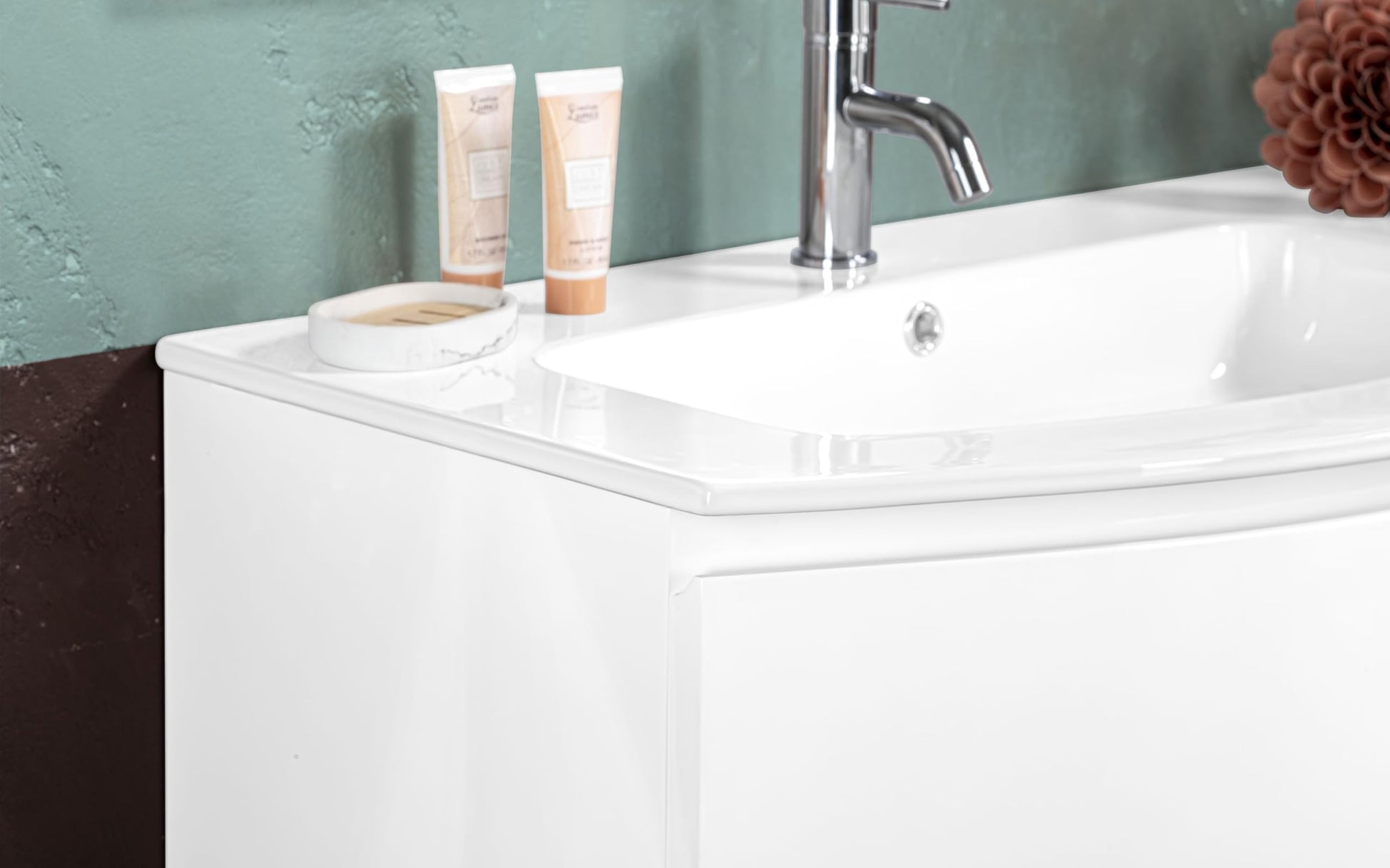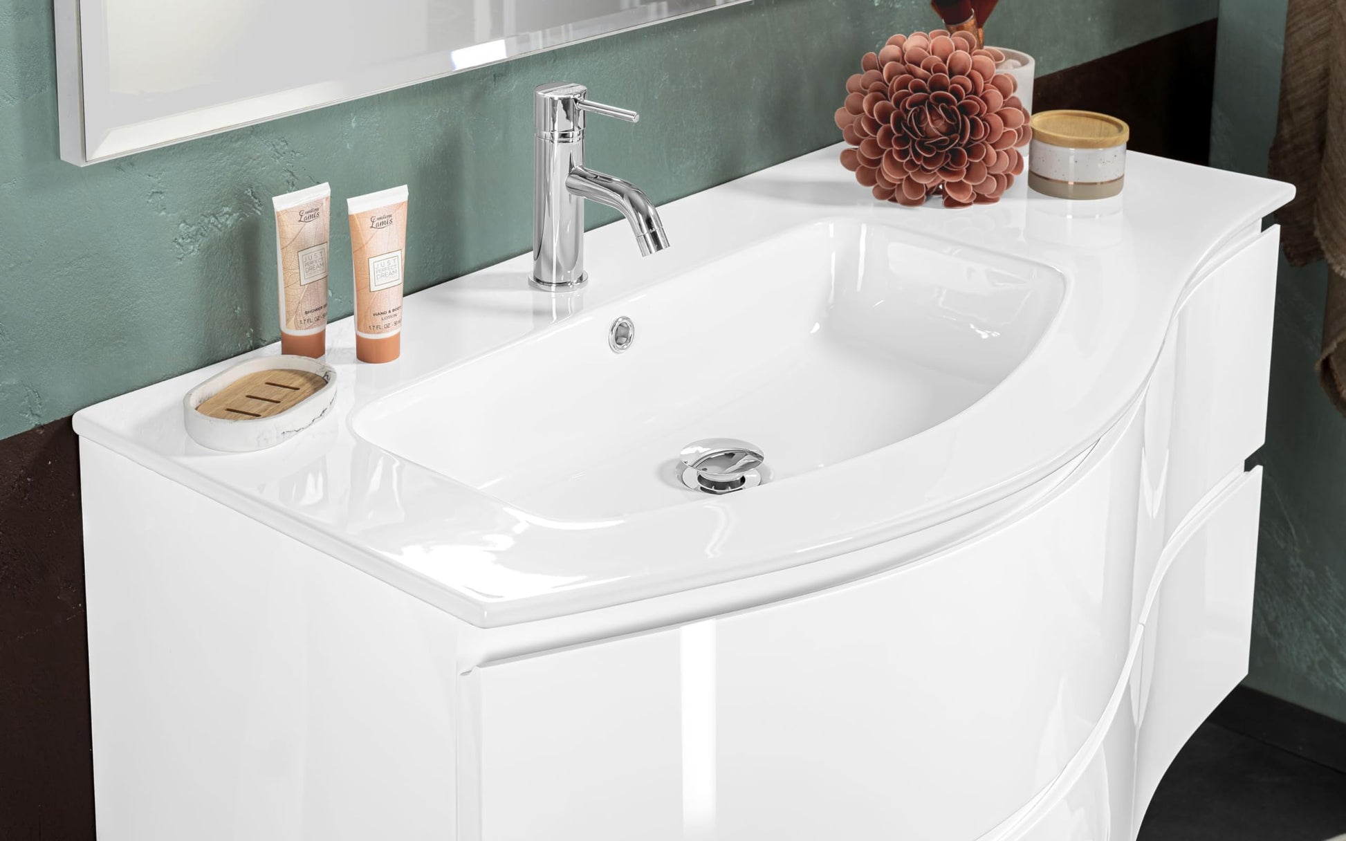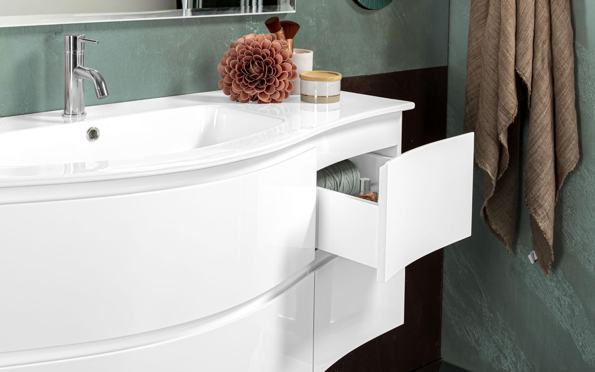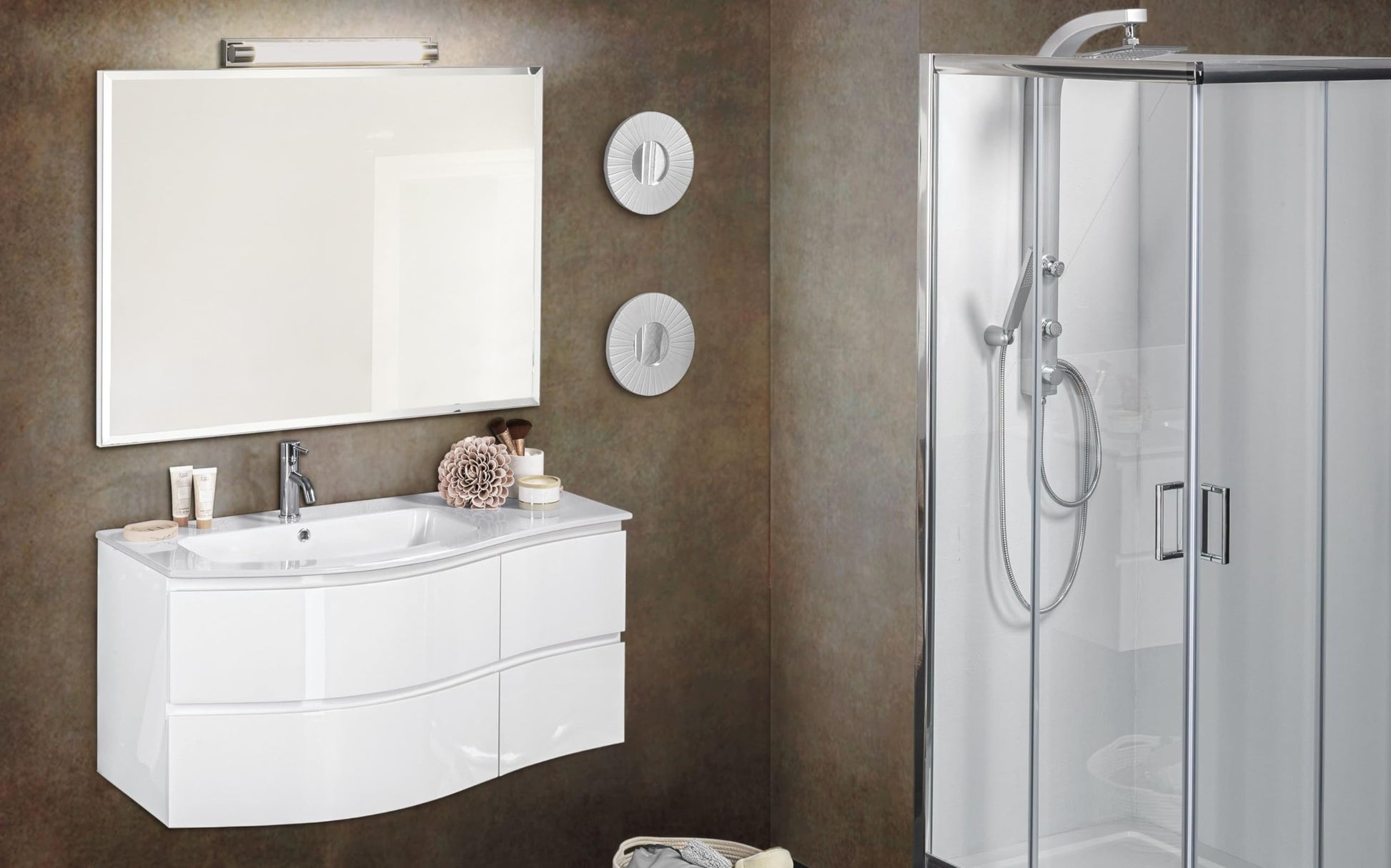 Dafne Italian Design Mobile da bagno componibile sospeso Elegance bianco laccato lucido cm 110 x 55 x 189 (base, lavabo in vetro, specchio)