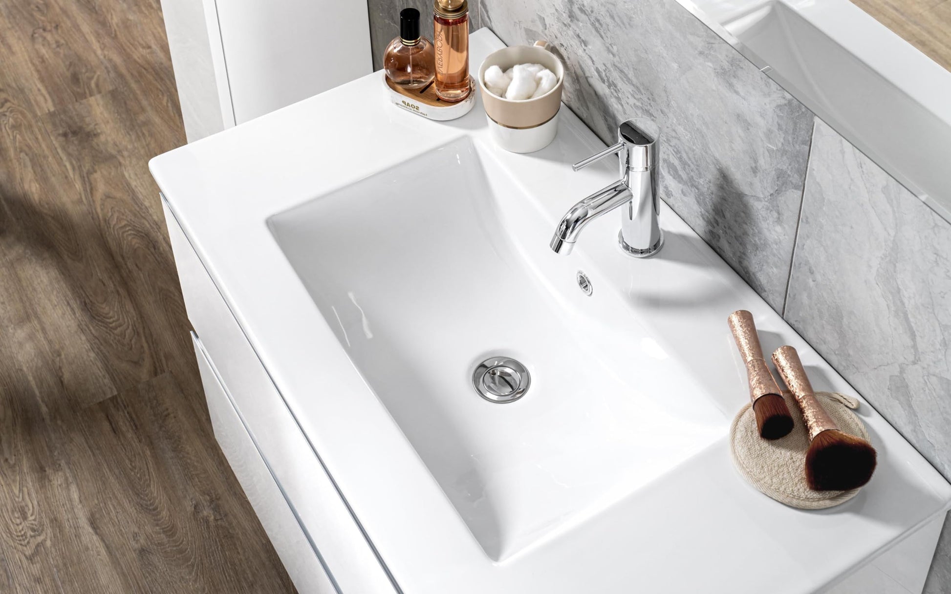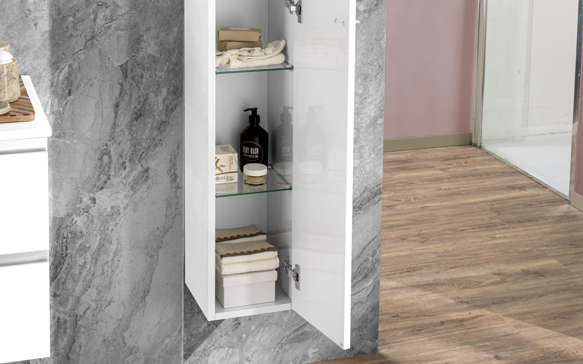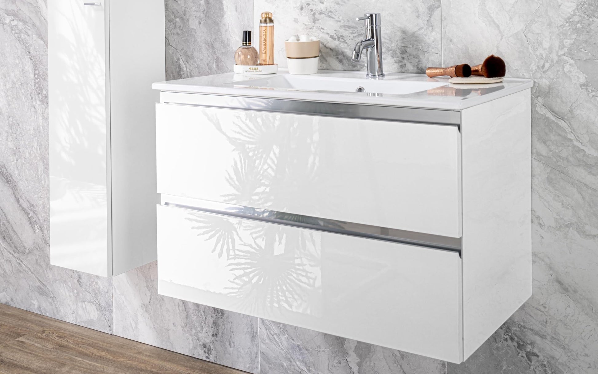 Mobile da bagno "Vichy" finitura bianco lucido composto da: componibile bagno sospeso cm. 81x46x189 (base, lavabo, specchio) - colonna sospesa cm. 25x27x160 - base mobile a terra cm. 69x34x85
